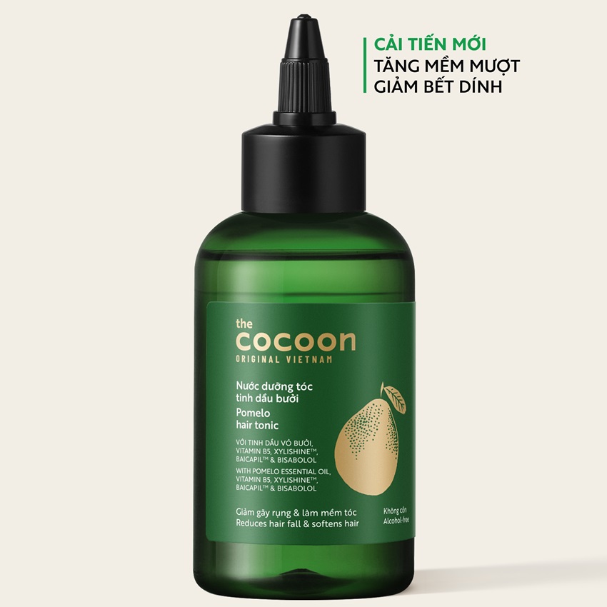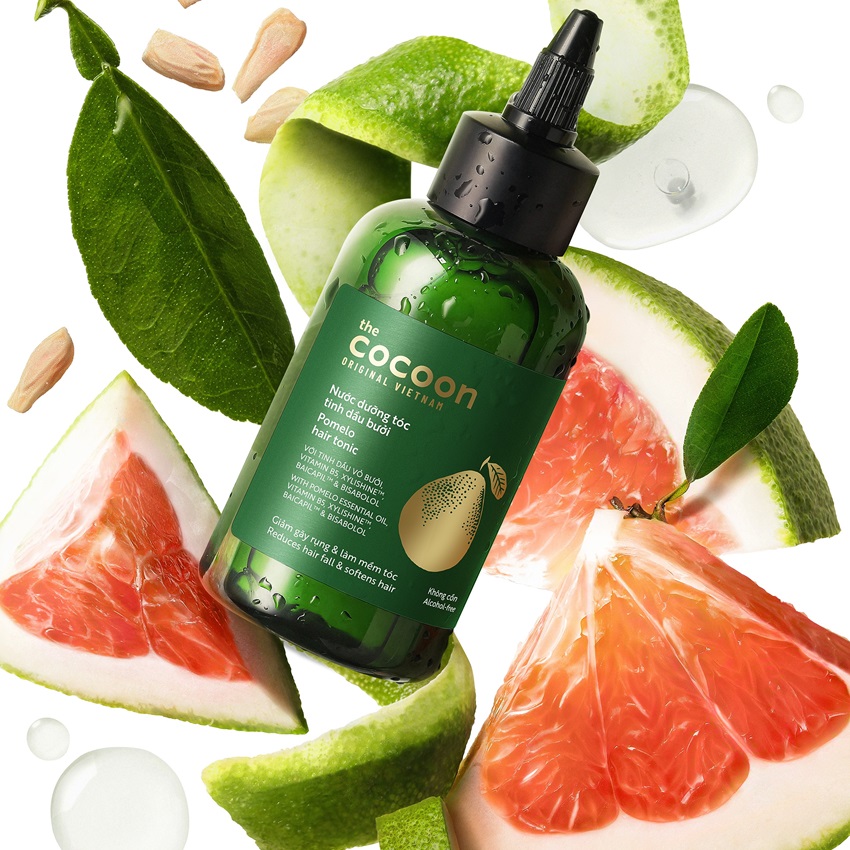 Nước dưỡng tóc tinh dầu bưởi pomelo Cocoon thuần chay phiên bản cải tiến là sản phẩm treatment dành cho tóc, phù hợp với tình trạng tóc rụng, tóc yếu, tóc thưa mỏng. Sản phẩm có thành phần từ tinh dầu bưởi Việt Nam truyền thống, Xylishine, Vitamin B5, Baicapil và Bisabolol. Nước dưỡng tóc tinh dầu bưởi giúp ngăn ngừa 60% nguyên nhân rụng tóc, làm gia tăng mật độ của tóc, từ đó giúp tóc dày lên trông thấy. Đồng thời, sản phẩm còn giúp nuôi dưỡng da đầu và cung cấp độ ẩm cho tóc.