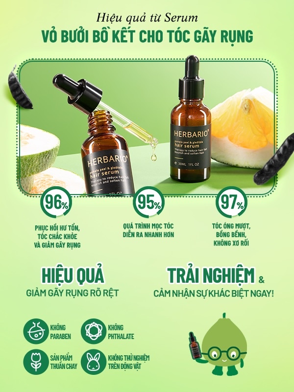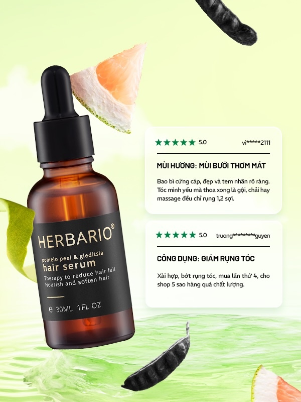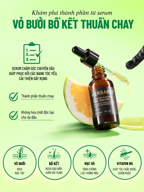 Serum Vỏ Bưởi & Bồ Kết Herbario giảm rụng tóc, giúp tóc mọc nhanh dày khỏe. Công thức thảo mộc kết hợp Vitamin B5, bạc hà và chiết xuất thiên nhiên nuôi dưỡng nang tóc.