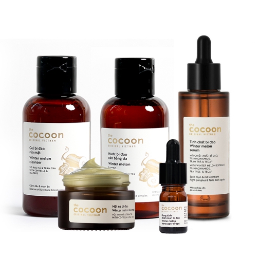 Bộ 5 chăm sóc da mụn chuyển sâu: Gel rửa mặt, Mặt nạ, Toner, Tinh chất, Chấm mụn bí đao Cocoon