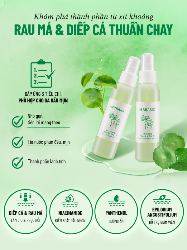 Công dụng Xịt khoáng rau má & diếp cá Herbario - Kiểm soát nhờn cực hiệu quả, giảm tiết dầu gây bít tắc lỗ chân lông.