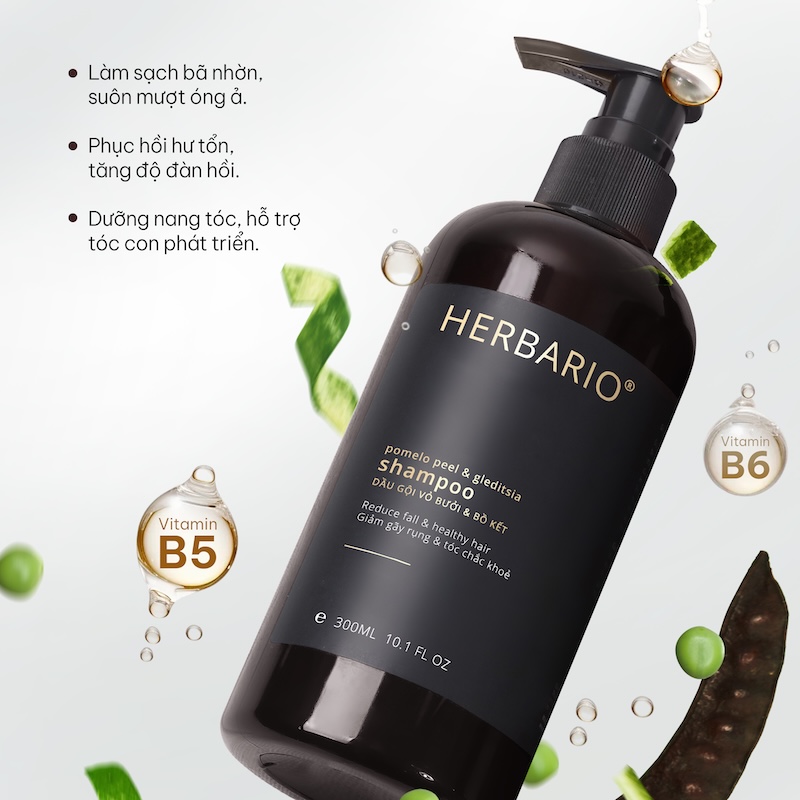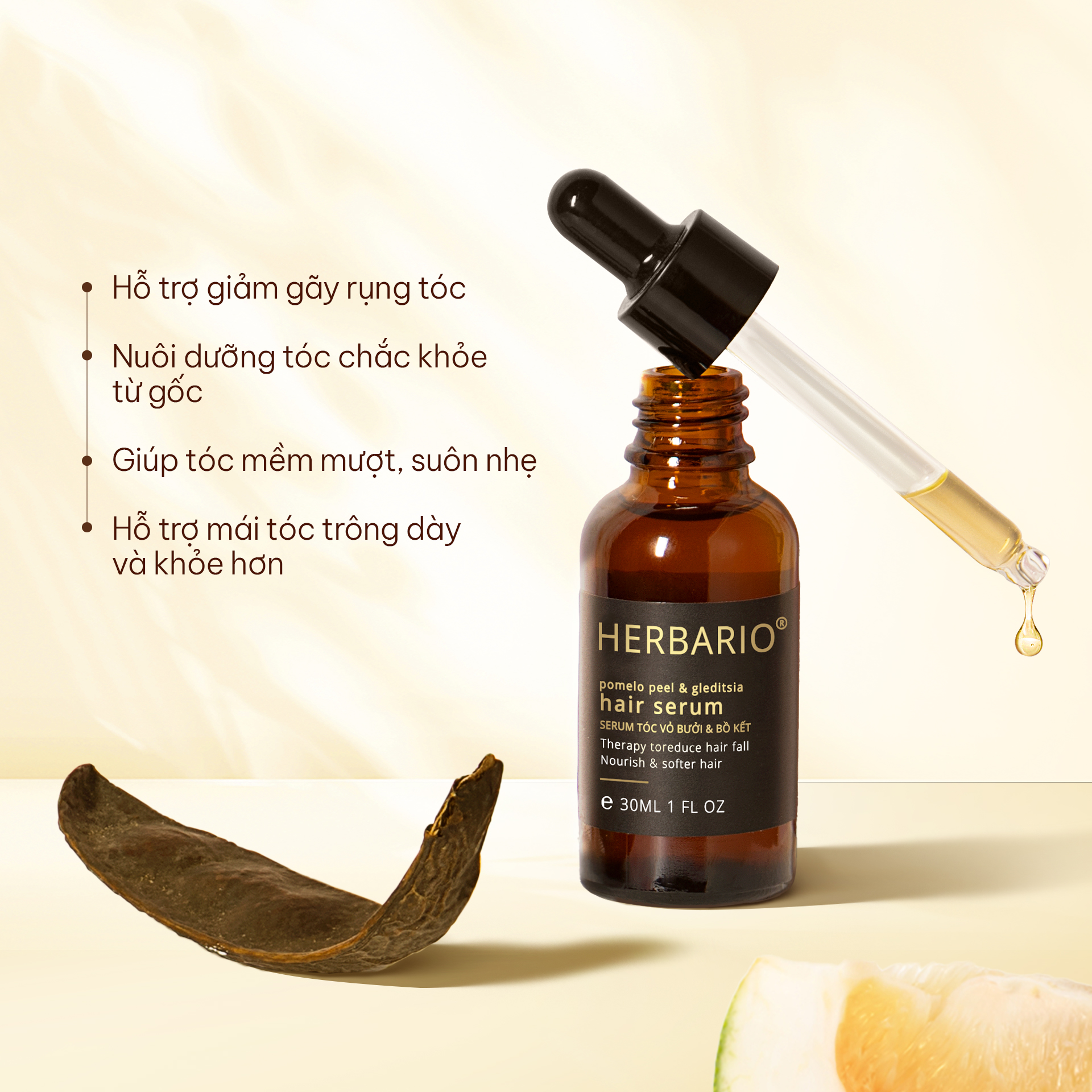 Bội dầu gội giúp sạch các bụi bẩn da đầu và Serum bưởi bồ kết Herbario giúp nuôi dưỡng tóc từ sâu bên trong hỗ trợ giảm rụng tóc, giúp tóc mọc nhanh.