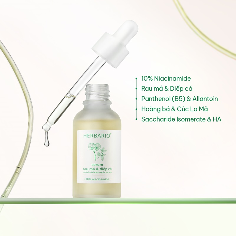 Serum Rau Má & Diếp Cá Herbario là tinh chất chăm sóc da với 10% Niacinamide kết hợp cùng các chiết xuất thảo mộc thiên nhiên, giúp hỗ trợ kiểm soát dầu, làm dịu da và chăm sóc da mụn hiệu quả. Công thức chứa các thành phần dưỡng ẩm và phục hồi giúp da luôn mềm mại, tươi sáng và khỏe mạnh hơn sau mỗi chu trình chăm sóc.