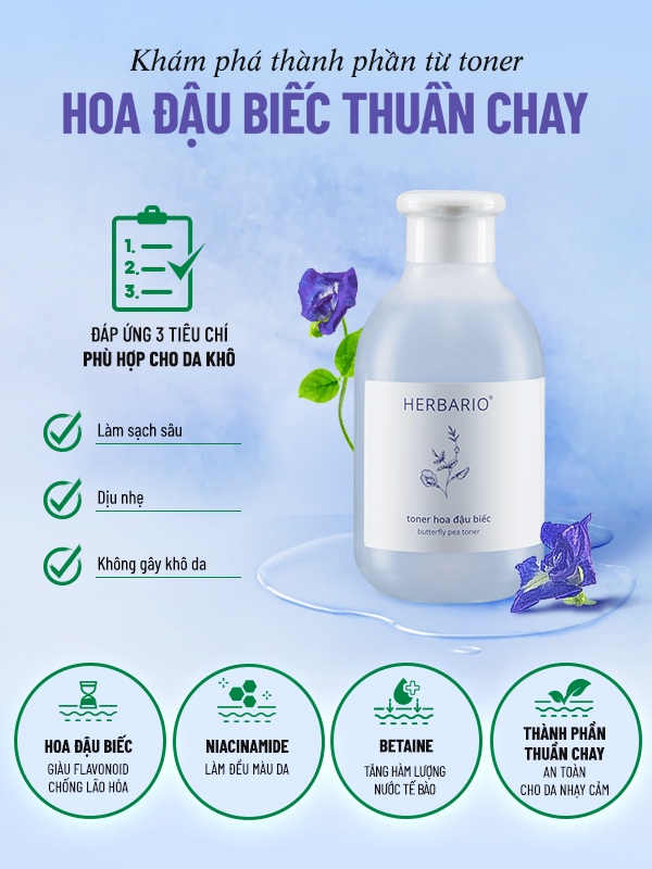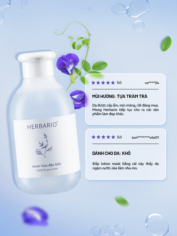 Mỗi khi trời lạnh lạnh là da mình lại bị bong tróc, khô rát rất khó chịu, từ khi được bạn giới thiệu xài toner hoa đậu biếc nhà Herbario thì da của mình đã được cải thiện hẳn, da được cấp ẩm triệt để, không còn khô mà rất mềm mịn rất thích. Đặc biệt ko gây nhờn rít hoặc kích ứng da, còn ngăn ngừa lão hóa hiệu quả. Cám ơn Herbario rất nhiều, mỹ phẩm thuần chay thiên nhiên nên rất yên tâm