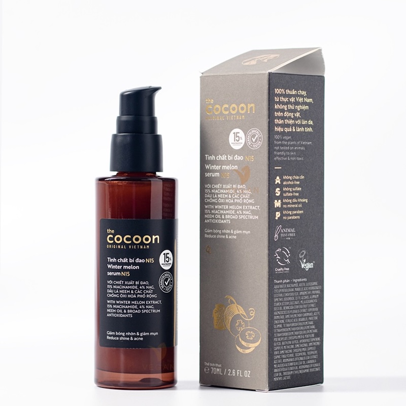 Tinh chất Serum bí đao N15 Cocoon 70ml Thuần Chay 15% niacinamide tinh khiết, 4% NAG phối hợp cùng dầu lá neem và các chất chống ôxy hoá phổ rộng giảm bóng nhờn và cải thiện tình trạng mụn.