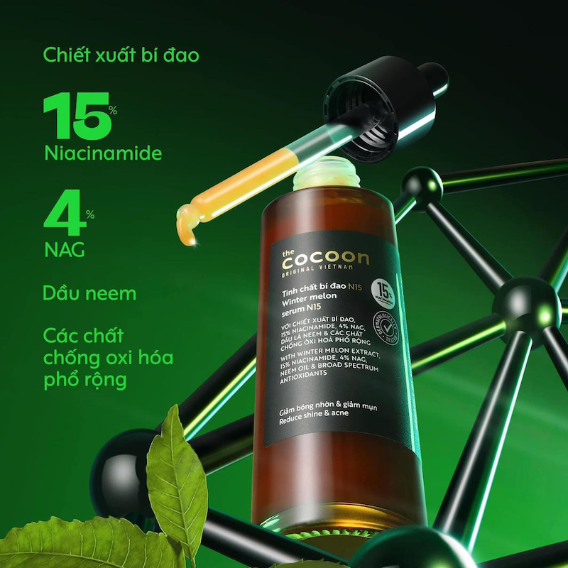 Serum tinh chất bí đao N15 COCOON: THẤM NHANH - MƯỚT MỊN - KHÔ RÁOlà cảm nhận đầu tiên khi những giọt tinh chất N15 “dạo chơi” trên làn da của bạn. Đột phá mang tên N15 có kết cấu sánh, sệt, tạo lớp màng mướt mát, nhẹ tênh với hiệu ứng “nhung lụa” kiềm dầu ngay lập tức, mang đến cho người dùng một trải nghiệm chăm sóc da mụn thoải mái, êm ái, xoa dịu những tổn thương và tiêu diệt mạnh mẽ những vết mụn viêm sưng.