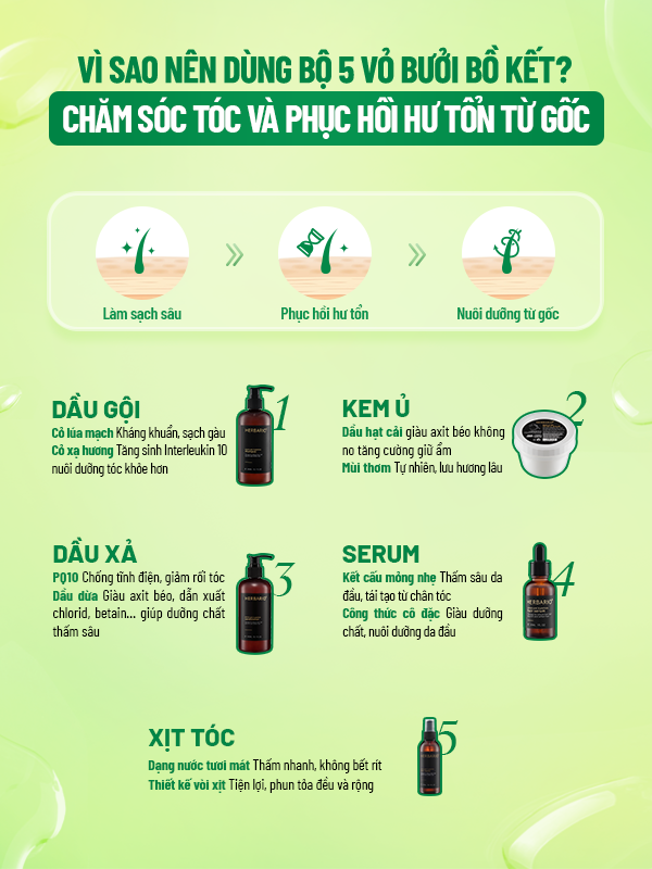 Ưu điểm bộ 5 chăm sóc tóc vỏ bưởi & bồ kết